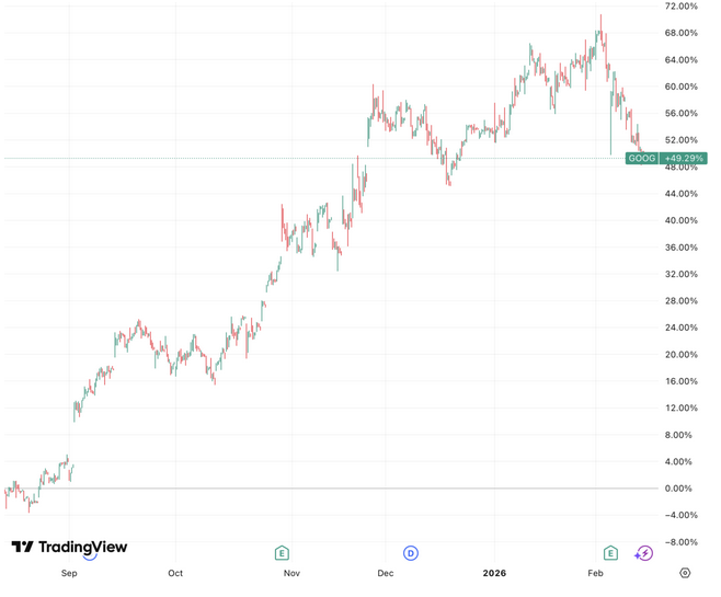 La récente baisse de l’action Alphabet doit être considérée comme une correction après 50 % de hausse en six mois plutôt que comme une sanction (infographie : TradingView)